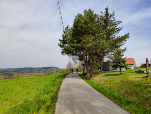Trasa maratonu prowadziła po pogórzach, w zasadzie w tej okolicy nie jeździłem rowerem, ale zakładałem, że jazda będzie podobna jak w Beskidzie Wyspowym. Tak było podobnie, krótkie ostre podjazdy jak i zjazdy. Część tych dróg była asfaltowa, ale szerokość jak to na takich drogach między wioskami, wąska na szerokość 1,5 samochodu. Trochę więc było mi strach puścić całkiem hamulce na zjazdach.