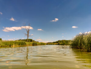 Ale skoro plan był na cały długi weekend, to trzeba się go trzymać, tym razem wodowanie poszło szybciej i zacząłem płynąć rzeką Obrą. Potwierdziło się wrażenie widziane z brzegu, rzeka w zasadzie nie ma nurtu, jest to rzeka mocno nizinna, a mocny wiatr a w zasadzie mordowiatr, powodował, ze gdy nie machałem wiosłem zaczynałem dryfować w górę rzeki. Po niecałym kilometrze zauważyłem, ze szybkie wodowanie ma pewne minusy – źle zamontowywałem sakwy na rufie i jedna sakwa mocno się zanurza. Sakwa zawierała w środku: aparat fotograficzny z obiektywem i drona, więc szybko postanowiłem znaleźć dogodne miejsce do przybicia do brzegu aby poprawić mocowanie sprzętu. Znalazłem wyjście na łąkę gdzie po sprawdzeniu miała być głębokość do kolan. Podczas próby wysiadania okazało się, że muł był miękki i noga mi się mocno zapadła na wskutek czego ponton się obrócił do góry nogami. Na szczęście wszystko było przymocowane, nic się nie nie zgubiło, a po wyjściu na brzeg sprawdziłem, ze do sakw się nic nie dostało. Więc poprawiłem mocowanie bagażu, sprawdziłem 2 razy czy jest dobrze zamontowane i wyruszyłem w dalszą drogę.