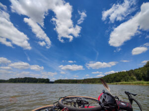 Pierwszy raz stanąłem przed dylematem, zamontowania na pacraft: roweru, 2 sakw i jednego worka 50L, pakowani e i wodowanie zajęło mi dobrze ponad godzinę. Już po wystartowaniu, kawałek dalej musiałem przybić do brzegu W i zmienić konfigurację montowania sakw na rufie pacrafta (tył). Ogólnie dziwnie mi się płynęło jeziorem, musiałem się mocno starać aby pacraft się poruszał. W zasadzie mocno skróciłem zaplanowaną trasę, bo za bardzo się męczyłem. Odcinek: Błotnica – Perkowo, dystans 2km.
