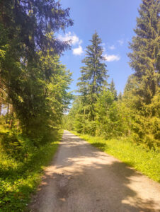 Część trasy DBC, pokrywała się z trasą z 2022r, jadać wracały wspomnienia z tego ultramaratonu. Sobota, była bardzo ciepła, wiec na jakieś 5 km przed Jordanowem okazało się, ze zapas wody się wyczerpał. Po analizie mapy, mogłem pojechać asfaltem, lub trzymać się wyznaczonej trasy wiodącej obok asfaltu lasem. Postanowiłem trzymać się wyznaczonej trasy, jechało się fajnie z góry, aż do do przejazdu przez jeden z rowów odwadniających, gdzie przebiłem dętkę. Pierwsza próba załatania – nie zdała egzaminu, drugiego przebicia nie umiałem znaleźć – postanowiłem więc założyć drugą dętkę. Znów się ubabrałem resztką mleka, ale wyruszyłem w dalszą drogę.
