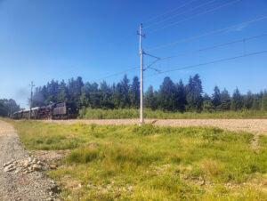 Z DBC z 2022r, pamiętałem świetną trasę pomiędzy Jordanowem i Osielec, która prowadziła w pobliżu trakcji kolejowej. Miałem nawet to szczęście, że przejeżdżał pociąg retro – zatrzymałem się aby zrobić mu zdjęcie.