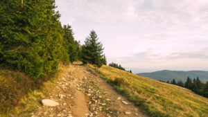 Dojście na Hale Boraczą to część drogą asfaltową, a później już tradycyjną beskidzką ścieżką. Na Hali Boraczej znajduje się schronisko, ale trzeba trochę zboczyć z planowanej trasy- w związku z czym odpuściłem podejście pod schronisko. Do tej Hali, droga cały czas prowadzi pod górę, temperatura była na tyle ciepła, że cały czas szedłem w krótkim podkoszulku, ale i tak mocno się pociłem na podejściach.