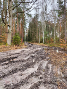W pewnym momencie po przedzieraniu się wśród powalonych drzew dotarłem do strumyka – Opusta, dość głęboko, aby go przejechać, dość szeroko aby przeskoczyć, wytyczona trasa wiodła równolegle do strumyka z drugiej strony – ale widać było że jest mocno błotnista. Postanowiłem pospacerować wzdłuż niego, gdyż warunki z mojej strony były lepsze niż z drugiej, a strumyk był po prostu „dość za …”. Po jakimś czasie znalazłem 2 drzewa po których teoretycznie dało by się przejść, ale istniało spore ryzyko zamoczenia się w strumieniu – więc dalej się przedzierałem (stopniowo się warunki pozraszały) wzdłuż strumienia. W końcu musiałem się przebić przez las do innej ścieżki, aby móc swobodnie jechać.