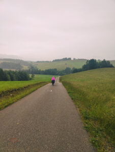 Zaraz po obiedzie, zaczął się najdłuższy podjazd na tej pętli, za miejscowość Zdiar. Wpierw trasa prowadziła ścieżką rowerową z dala od głównej drogi, ale niestety później trzeba było wrócić na główną trasę samochodową. Rok temu, tutaj opuściły mnie resztki sił, na przystanku samochodowym, znalazłem kawałek cienia i tam ponad godzinę drzemałem. Tym razem, aura pogodowa była pomocna w podjeździe, nie padało, więc udało mi się w miarę szybko podjechać na koniec podjazdu. Oczywiście na górze czekała na mnie Ewelina.