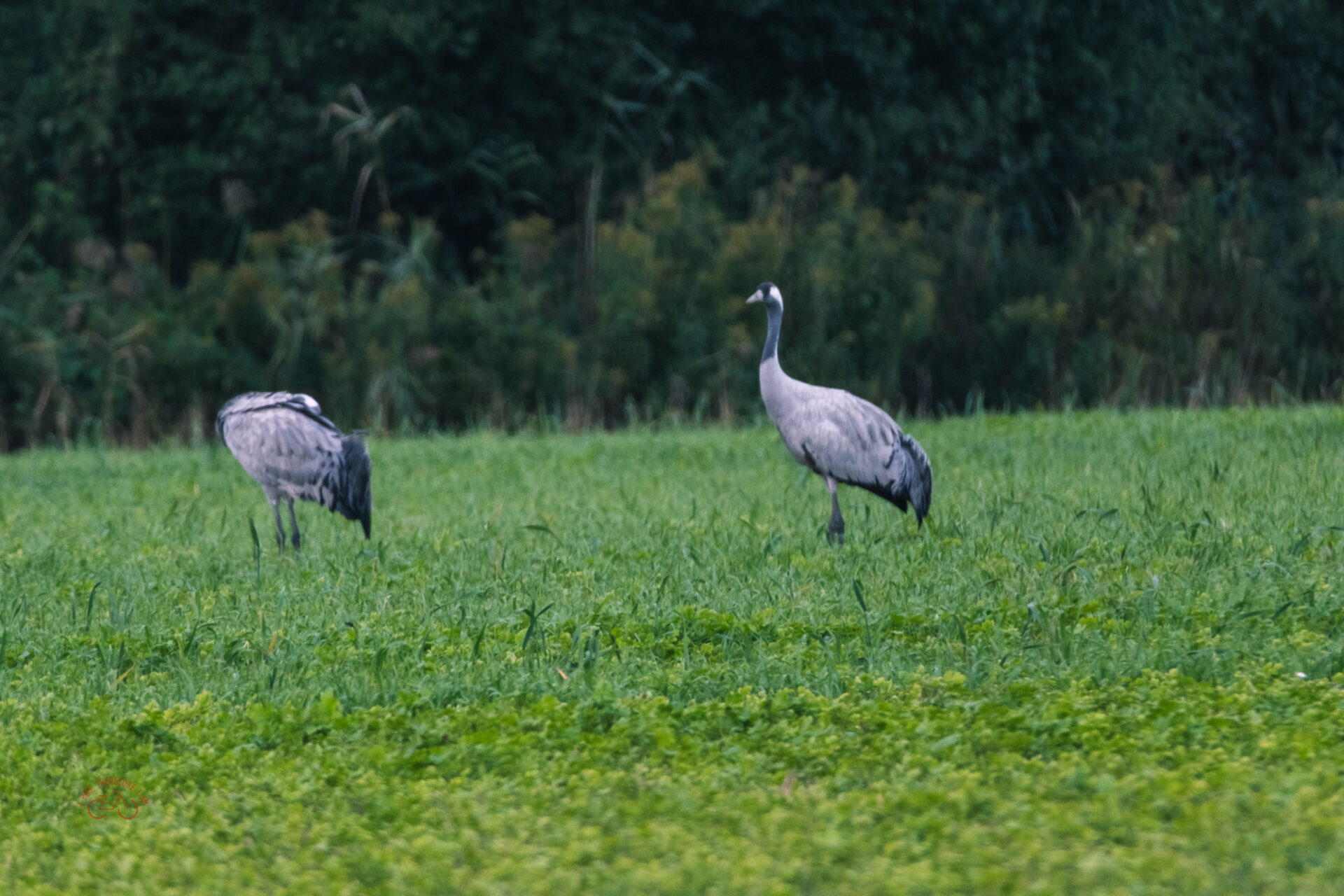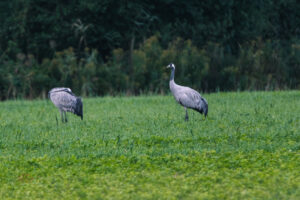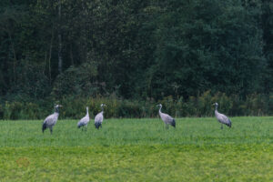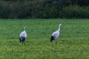 Po wschodzie słońca wróciliśmy na śniadanie do Winnicy w Krośnicy gdzie nocowaliśmy. W drodze jednak zobaczyliśmy na łące spacerujące dwa Żurawie, w momencie gdy się zatrzymałem kilka Żurawi właśnie lądowało na tej samej łące – jednak zanim wyciągnąłem aparat już było po akcji – moglem zrobić zdjęcie jak spacerują.