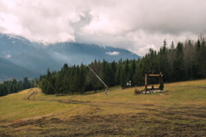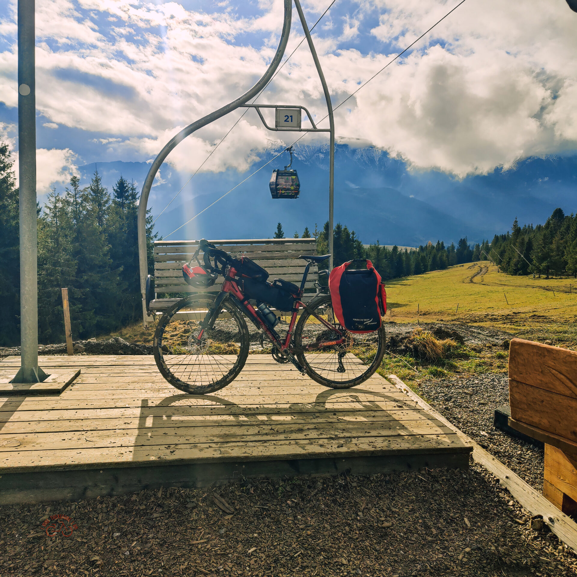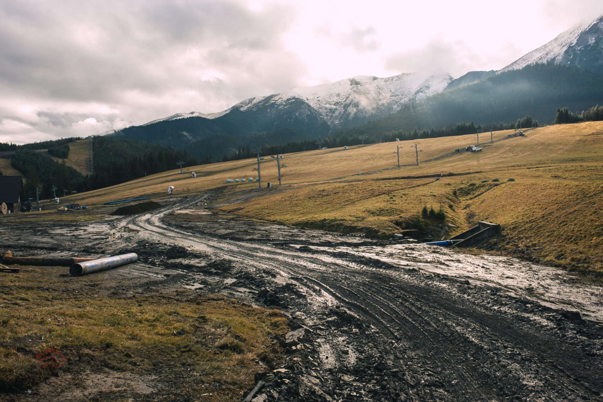 Z parkingu zjechałem ścieżką rowerową w kierunku widocznych wyciągów w dolinie. Słowo zjechałem, to duże nadużycie, bo po około 200-300m musiałem prowadzić rower, gdyż w dolinie trwały prace budowlane z przygotowaniem do zimowego sezonu. czyli ścieżka rowerowa była cała rozjeżdżona przez ciężki sprzęt, wiec po chwili miałem całe widełki zapchane błotem.